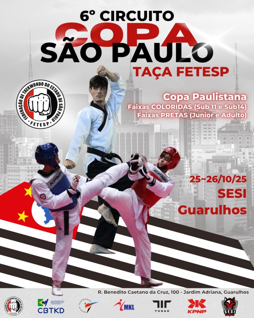 A FETESP – Federação de Taekwondo do Estado de São Paulo -, divulga o ofício do 6º CIRCUITO COPA SÃO PAULO 2025, TAÇA FETESP. Acesse o link abaixo para mais informações sobre o evento: OFICIO CIRCUITO FINAL COPA SÃO PAULO, TAÇA FETESP